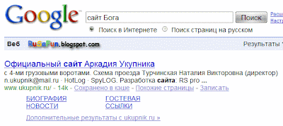 | Поисковики шутят (Официальный сайт бога) Официальный сайт певца и композитора Аркадия Укупника, Google считает ни больше ни меньше, а ровно как "официальный сайт бога"! Видимо Гуглу очень нравится творчество Аркадия и он считает Укупника богом российской эстрады. А иначе зачем бы он ставил его сайт на первое место в выдаче по запросам "официальный сайт бога" и просто "сайт бога"? Это гуглбомбинг - артефакт поисковой системы (не обязательно Google), когда какой-нибудь запрос приводит к выдаче абсурдного или провокационного результата. Например, первая широко известная гугл-бомба — фраза «more evil than satan himself» («большее зло, чем сам сатана»). В ответ на такой поисковый запрос Google в 1999 году первым результатом возвращал ссылку на официальный сайт Microsoft[1]. Также долгое время в ответ на поисковый запрос «miserable failure» («законченный неудачник» — англ.) Google первым результатом выдавал ссылку на сайт президента США Джорджа Буша. При поиске «find Chuck Norris» на первом месте в выдаче находилась страница http://clients.arranschlosberg.com/chuck/index.htm, созданная по теме шуток о Чаке Норрисе (предполагается нажимать на кнопку Мне повезет/I feel lucky) В конце 2007 года Яндекс также был подвержен известному гуглбомбингу, например при вводе в Яndex’е «гавно» — первая ссылка вела на сайт Мегафона. Ещё 1 яркий пример примерно в это же время (конец [2007]) Яндекс был подвержен гуглбомбингу, например при вводе в Яndex’е слова «отстой» первая ссылка вела на сайт МТС. Гугл-бомбы иногда являются случайной ошибкой поисковой системы, но многие из них, особенно связанные с острыми социальными и политическими конфликтами, создаются искусственно в целях пропаганды, как то было во время проведения досрочных парламентских выборов 2007 года на Украине: на этот раз поисковая машина связала словосочетание «капец стране» с сайтом блока Юлии Тимошенко («БЮТ»). Для этого используется техника поискового спама. Аналогичная попытка белорусских пользователей в 2006 году имела частичный успех в Яндексе — по запросу «ложь» одной из первых выдавалась ссылка на сайт Белорусского Телевидения.